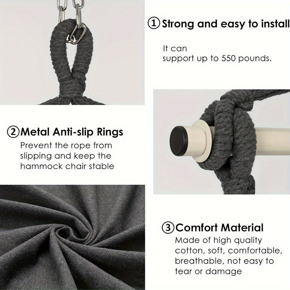 This hammock chair swing combines a relaxed boho style with practical functionality. Its spacious seating and soft cushions make it perfect for reading, lounging, or simply enjoying some quiet time. Lightweight yet strong, it can be easily installed in gardens, living rooms, or even at events like weddings. Suitable for teens and adults, it adds a touch of comfort and charm to any space.