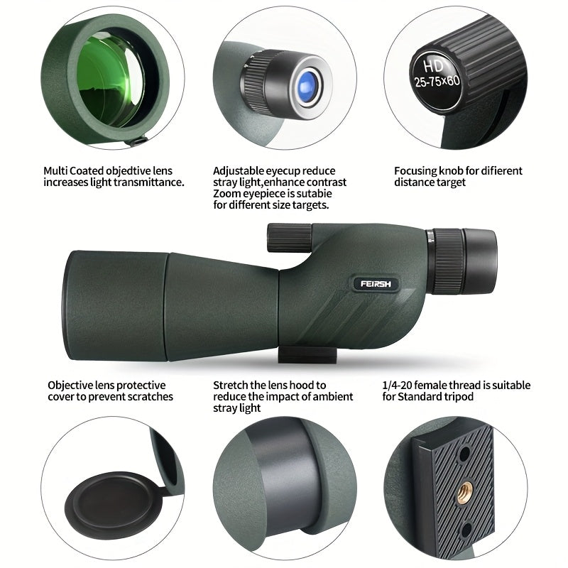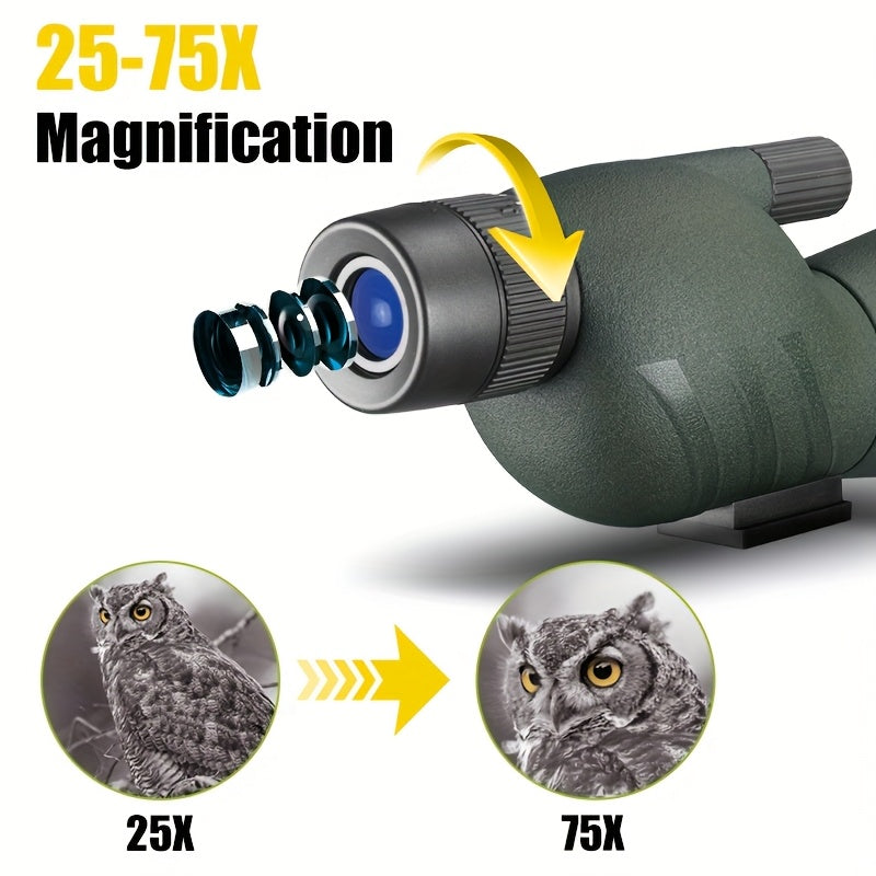 Experience powerful long-distance viewing with this 25–75x60 HD spotting scope, designed for outdoor enthusiasts who need clarity and precision at extended ranges. Ideal for birdwatching, wildlife observation, camping trips, and target spotting, this scope delivers detailed views of distant subjects with adjustable high-power magnification.